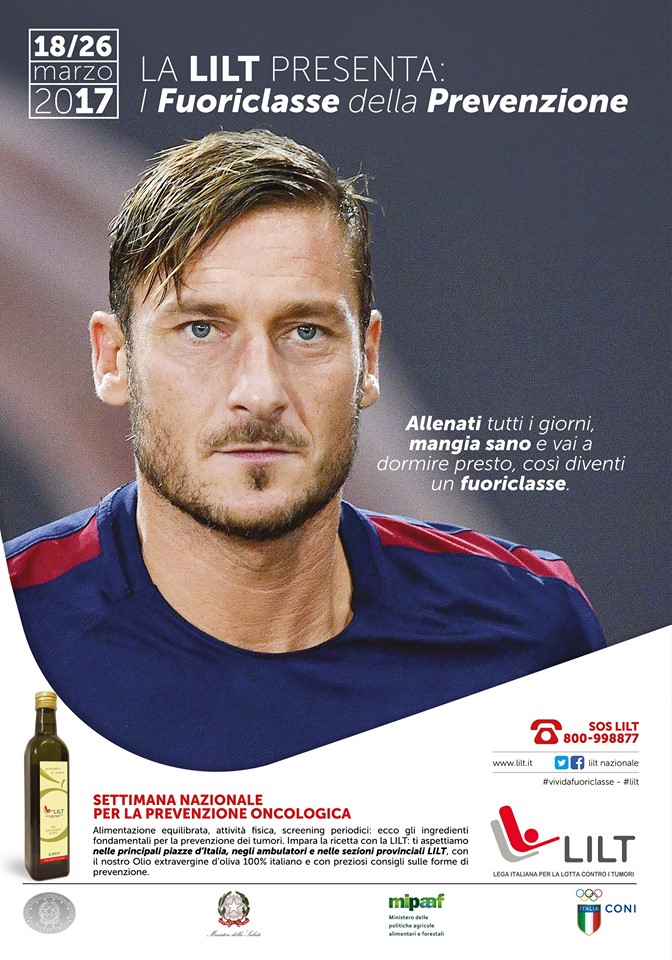 Lo scopo della campagna è quello di diffondere la cultura della prevenzione oncologica, attraverso la promozione dei corretti stili di vita, a cominciare dalla condotta alimentare. Quest’anno, alla Settimana Nazionale per la Prevenzione Oncologica hanno gratuitamente prestato la propria immagine il campione di calcio Francesco Totti e lo chef stellato Massimo Bottura, due fuoriclasse dell’alimentazione e, quindi, della prevenzione.