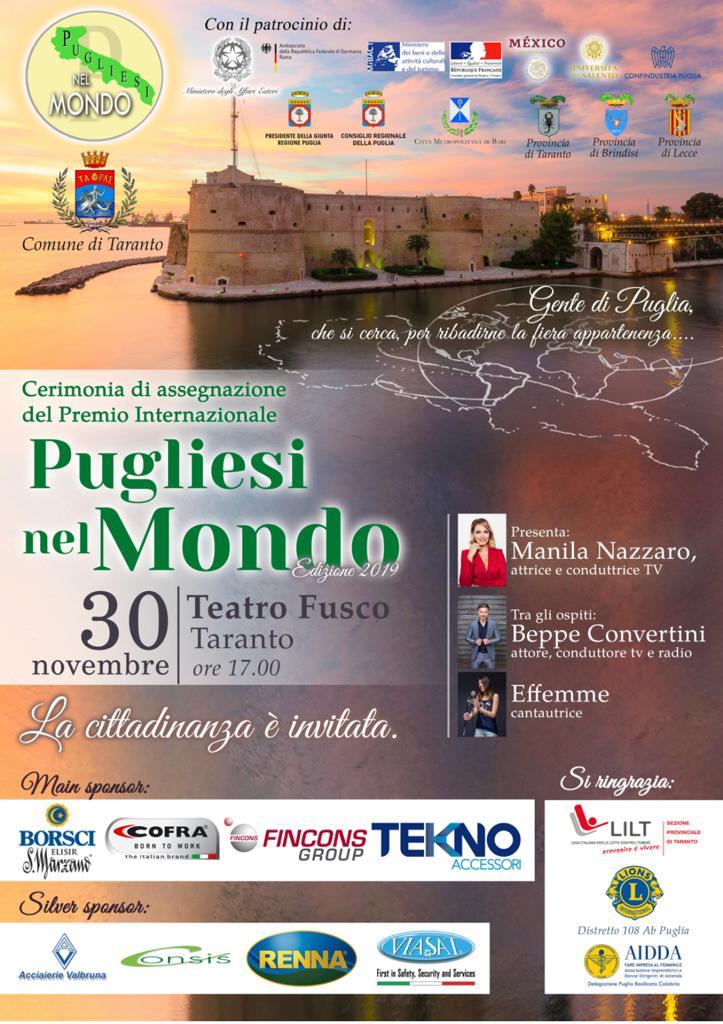 Anche quest’anno l’Associazione Internazionale “Pugliesi nel Mondo” premia l’ingegno, la competenza e la professionalità dei figli di Puglia che si sono distinti per eccellenza in ogni latitudine. A sostegno dell’iniziativa anche la Sezione Provinciale della Lilt, presieduta da Perla Suma, che è anche coordinatrice delle Donne Pugliesi nel Mondo, all’interno dell’associazione organizzatrice.