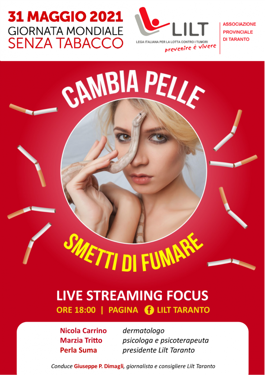 Anche di questo si parlerà nel focus online organizzato per il prossimo 31 maggio dalla Lilt ionica sulla propria pagina Facebook, con inizio della diretta alle ore 18:00. Il talk, intitolato Cambia pelle, smetti di fumare, si soffermerà in particolare sulla relazione esistente tra il fumo e le patologie della cute, dagli inestetismi alle lesioni tumorali, ma approfondirà anche la prospettiva possibile per un fumatore di cambiare vita, abbandonando il vizio grazie al supporto psicologico specialistico.
