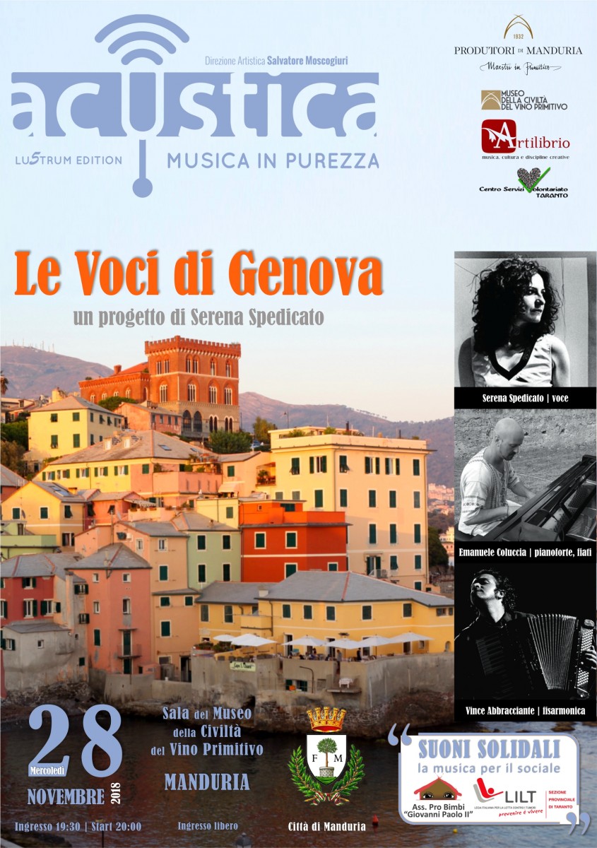 Questo luogo dell’anima e la sua eterna fucina di cantautori sono il tesoro tirato a lucido da Serena Spedicato, che con il suo progetto “Le Voci di Genova” il 28 novembre a Manduria sarà protagonista del prossimo concerto di “Acustica - musica in purezza”.