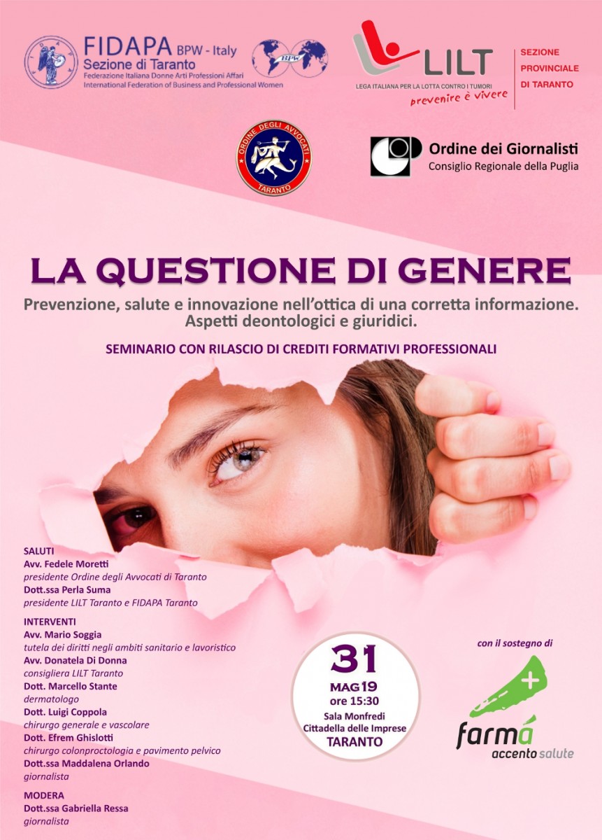 L’iniziativa, organizzata dalle sezioni provinciali della Lega Italiana per la Lotta contro i Tumori (Lilt) e della Federazione Italiana Donne Arti Professioni Affari (Fidapa), vede la collaborazione del consiglio regionale pugliese dell’Ordine dei Giornalisti e dell’Ordine degli Avvocati di Taranto, i quali riconosceranno dei crediti formativi professionali ai rispettivi iscritti che prenderanno parte all’evento.