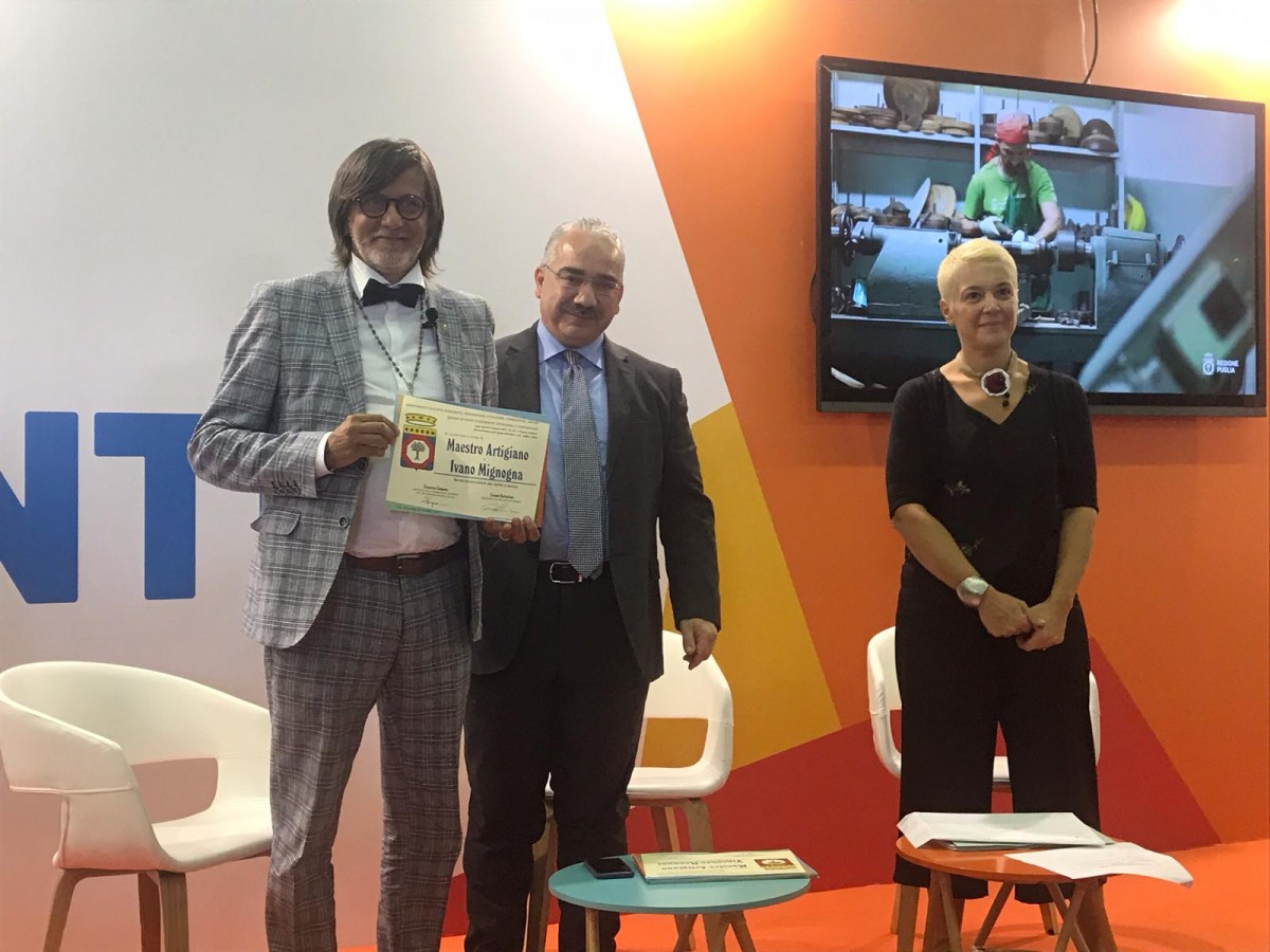 In perfetta corrispondenza con tali caratteristiche, Ivano Mignogna ha ricevuto l’attestato di “Maestro Artigiano” dalle mani dell’assessore regionale allo Sviluppo Economico Cosimo Borraccino, nel corso di una cerimonia tenutasi lo scorso 20 settembre nella Fiera del Levante, che lo ha visto unico tarantino tra i trentotto artigiani insigniti.