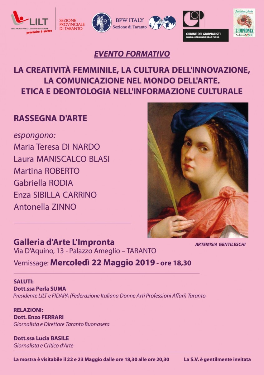 Il 22 maggio 2019 dalle ore 18,30 alle 20,30 presso la Galleria L’Impronta (Palazzo Ameglio, Via d'Aquino) a Taranto, si terrà l'evento formativo intitolato “La creatività femminile, la cultura dell’innovazione e la comunicazione nel mondo dell’arte. Etica e deontologia nell’informazione culturale”.