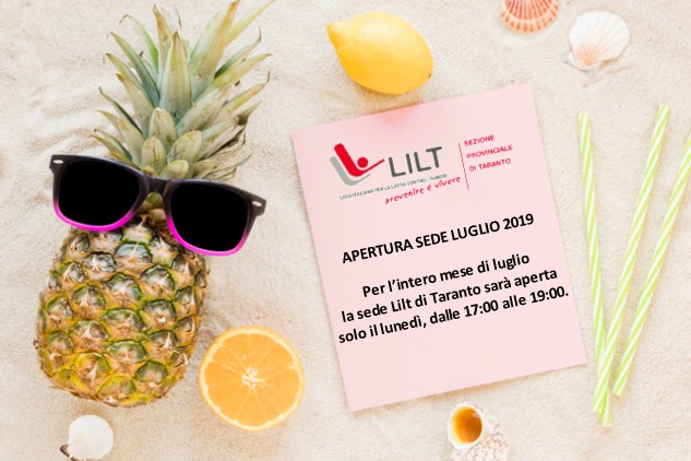 La Sezione Provinciale di Taranto della Lega Italiana per la Lotta contro i Tumori (LILT) comunica che per tutto il mese di luglio la propria sede di Piazzale Dante 2 (Zona Bestat) resterà aperta solo nelle giornate di lunedì, dalle ore 17:00 alle ore 19:00.