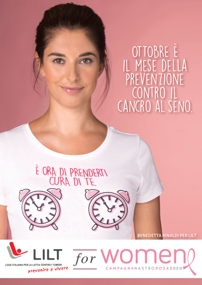 La campagna di comunicazione 2020 ha il volto della giornalista Benedetta Rinaldi, co-conduttrice della trasmissione Elisir su Rai3 e impegnata in Lilt con il ruolo di coordinatrice nazionale della Consulta Femminile. Prestando la sua immagine, la testimonial ricorda a tutte le donne che è ora di prendersi cura di sé attraverso una visita di controllo.