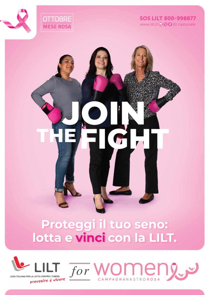 «Join the fight» è il grido di battaglia che la Lega Italiana per la Lotta contro i Tumori lancia a tutte le donne, in occasione della tradizionale campagna Lilt for Women - Nastro Rosa di ottobre, finalizzata alla prevenzione del carcinoma mammario.