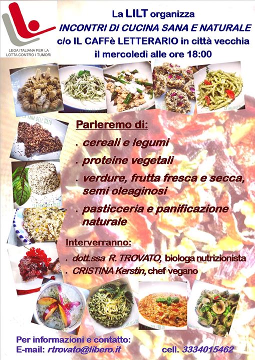 Torna a Taranto il Corso di cucina sana e naturale, già sperimentato con successo lo scorso anno. Promosso dalla Sezione Provinciale di Taranto della Lega Italiana per la Lotta contro i Tumori (Lilt) e organizzato dalla biologa nutrizionista Raffaella Trovato, il percorso formativo punta al conseguimento delle conoscenze di base e degli strumenti necessari per seguire un’alimentazione ispirata agli equilibri della natura, mediante l’esclusione di alimenti di derivazione animale e con l’uso di materie prime di origine biologica.