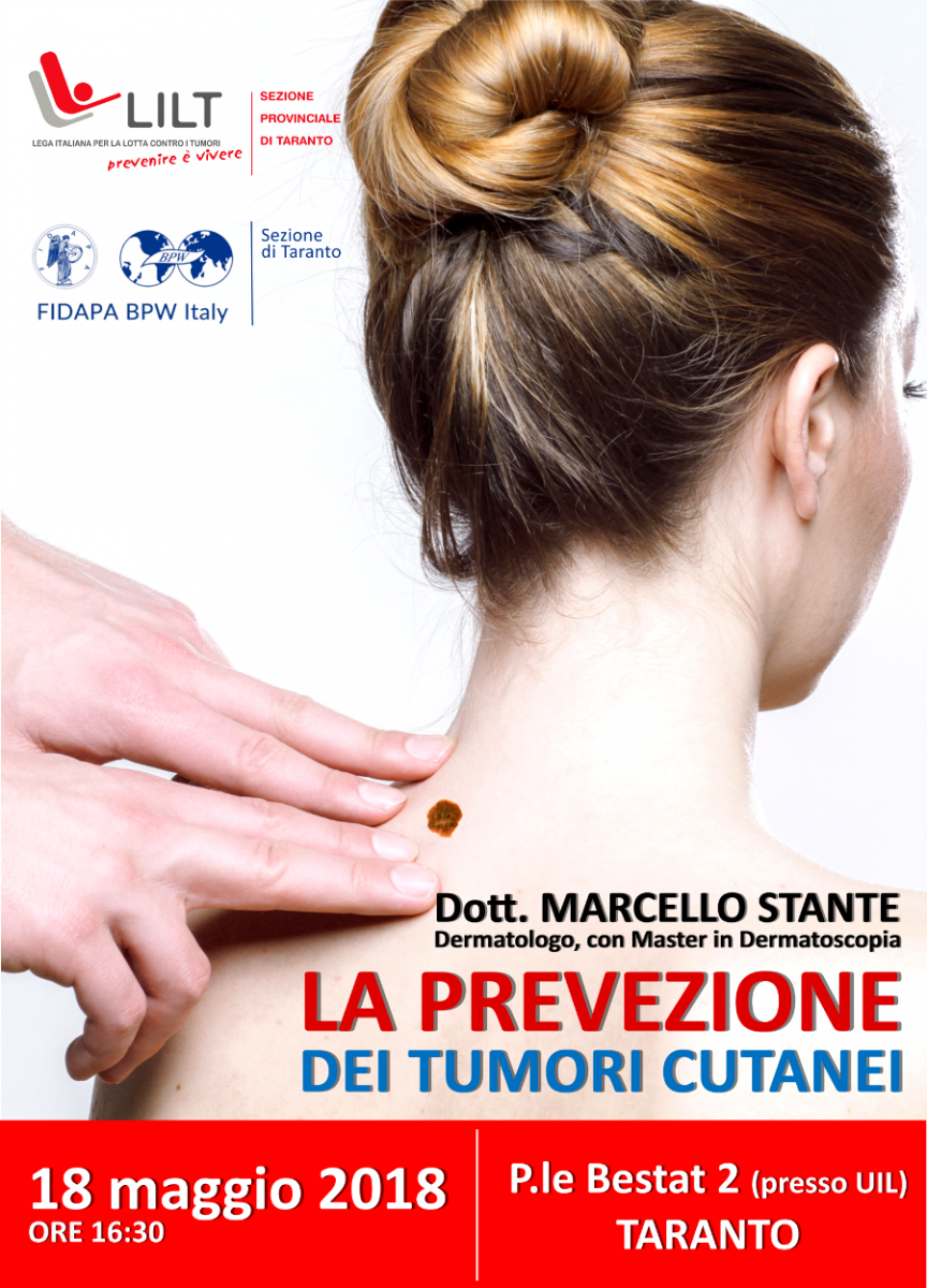 La Sezione Provinciale di Taranto della Lega partecipa alla campagna con una conferenza sul tema, organizzata con la collaborazione della sezione tarantina della FIDAPA. L’incontro, aperto al pubblico, si terrà nel capoluogo ionico, in piazzale Bestat 2, presso la UIL di Taranto, alle 16:30 di venerdì 18, e vedrà come relatore unico il dott. Marcello Stante, dermatologo con all’attivo un master in dermatoscopia.
