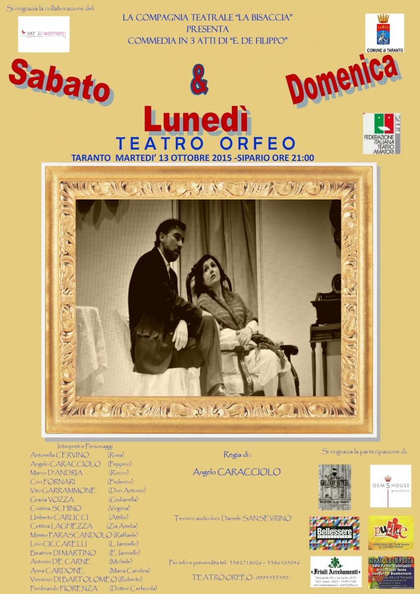 In occasione dell'annuale manifestazione dedicata all'informazione e alle buone pratiche per la prevenzione dei tumori della mammella, La Lilt ionica organizza una raccolta fondi destinata a sovvenzionare azioni concrete sul territorio, tese a limitare l'insorgenza di tali patologie. Sarà possibile contribuire alla causa assistendo alla commedia di Eduardo De Filippo "Sabato domenica e lunedì", che andrà in scena alle 21.00, martedì 13 ottobre al Teatro Orfeo di Taranto.